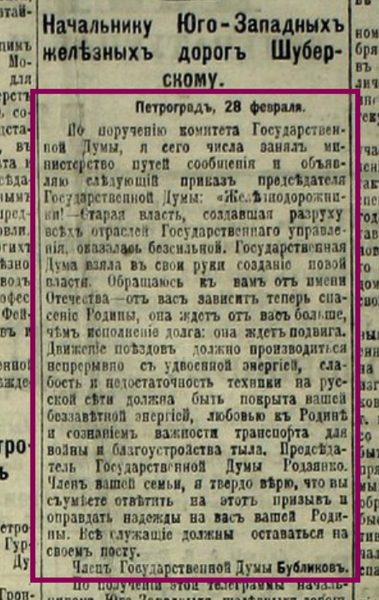 Вже о 13 годині 50 хвилин на всі залізничні станції була відправлена перша телеграма-“твітт”. Випереджаючи події (нагадаємо, що Микола ІІ на той час престолу ще не зрікся), Бубліков урочисто повідомляв всю країну про зміну влади.