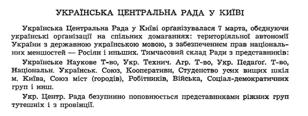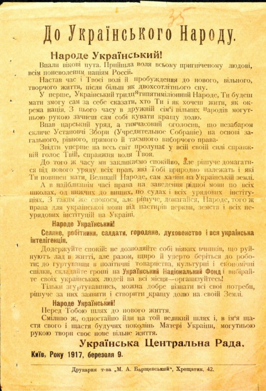 “Народе Український! Впали вікові пута. Прийшла воля всьому пригніченому людові, всім поневоленим націям Росії. Настав час і твоєї волі й пробудження до нового, вільного, творчого життя після більш як двохсотлітнього сну.