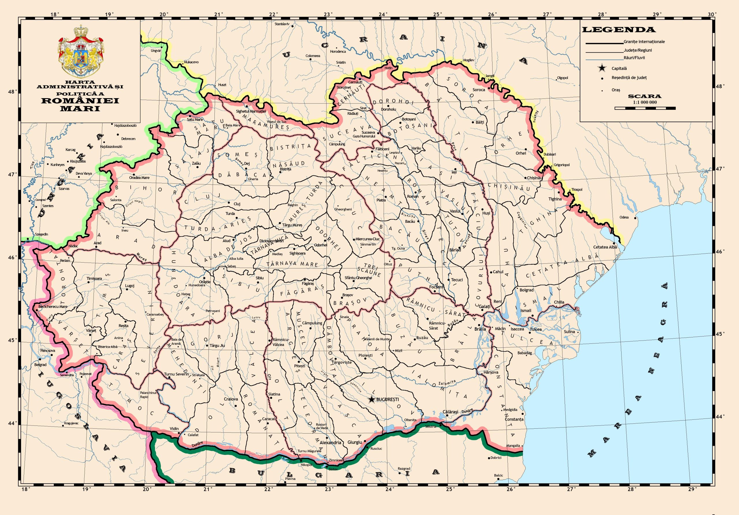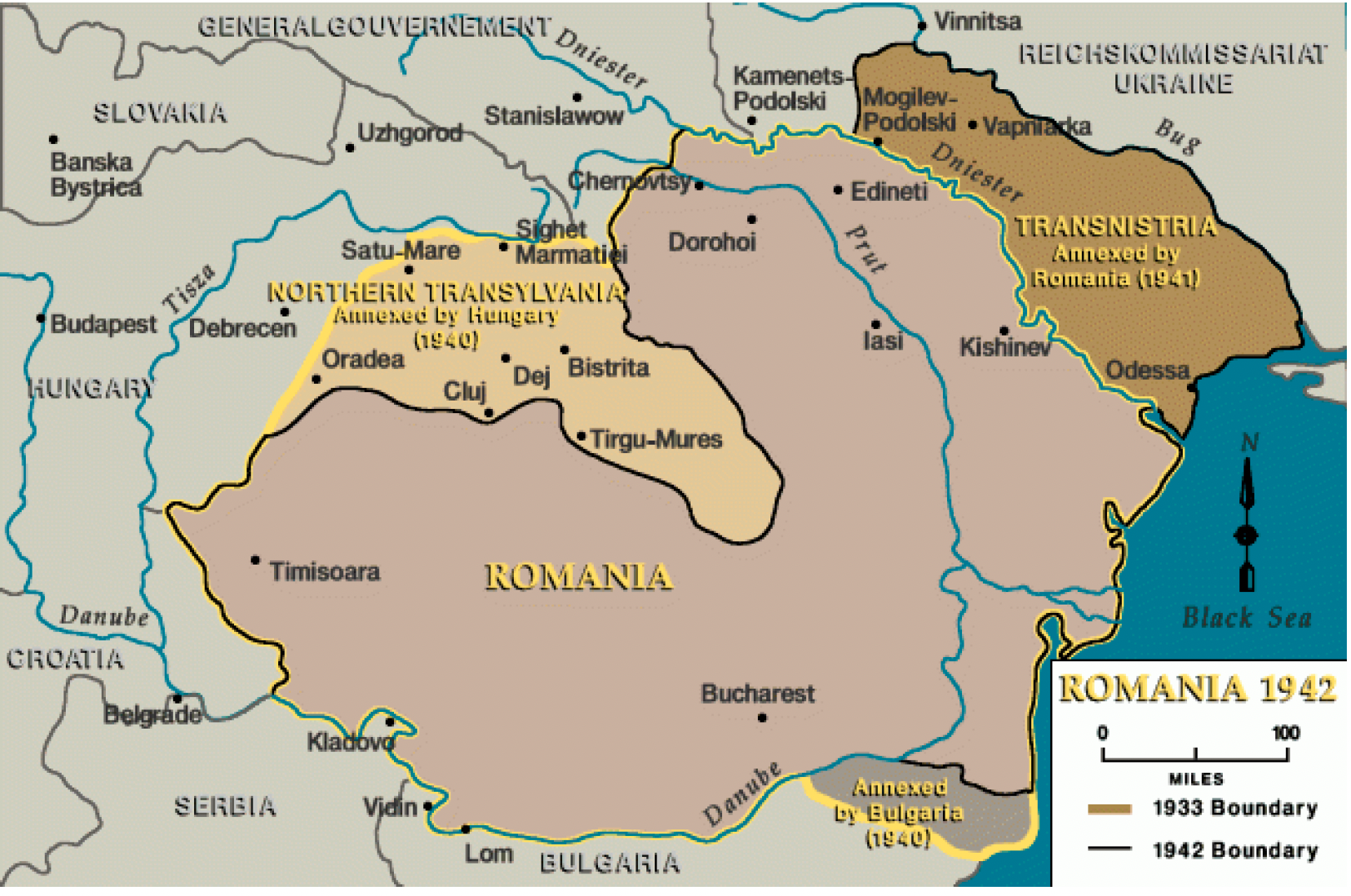 Поширена пропагандистська мапа Румунії на 1942 р. Попри втрату частини Трансильванії містить Буковину та Бессарабію та Трансністрію (міжріччя Дністра та Південного Бугу), – території сучасних України та Молдови
