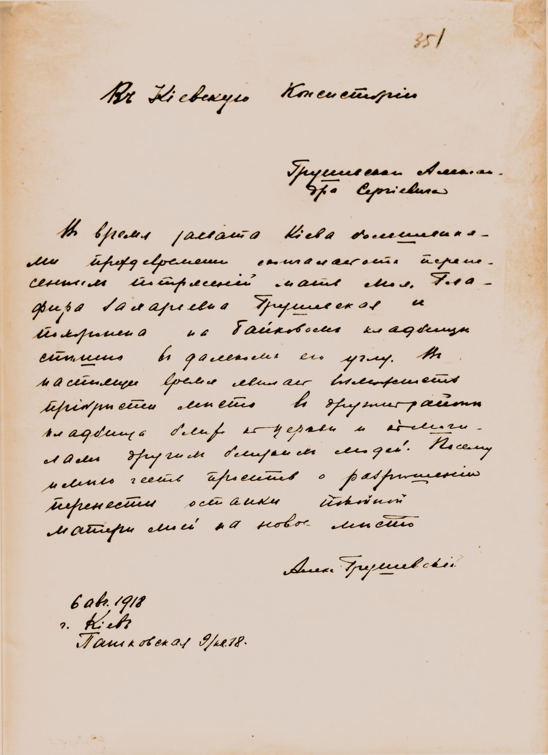 7. Лист Олександра Грушевського до Київської духовної консисторії з проханням дати дозвіл на перепоховання матері Глафіри Грушевської на Байковому кладовищі. 6 серпня 1918 р.